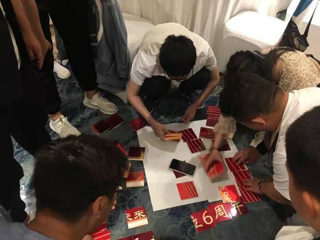 各組的小伙伴們獻計獻策,不斷的互相尋求幫助,雖然是比賽,但是大家似乎已經(jīng)忘記各組的得失,互相指導(dǎo),一組一組的完成了每一部分的拼接。為了節(jié)約時間,八個小組中提前拼接好的部分先進行組裝,沒有總指揮、沒有領(lǐng)導(dǎo)者、唯一的信念就是快速完成背景板的拼接。最終在30分鐘之內(nèi)完成了拼圖。比我們活動策劃的預(yù)計時間提前了一個小時。